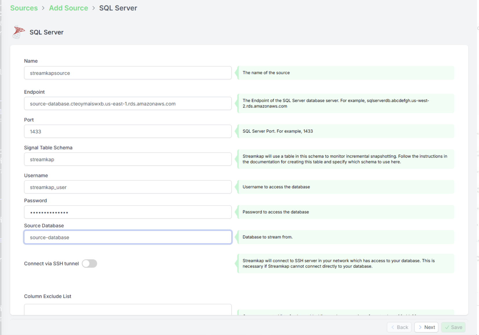 - Адрес сервера SQL Server, порт, имя пользователя и пароль. Рекомендуется создать для Streamkap отдельного пользователя и роль для доступа к вашей базе данных SQL Server. Ознакомьтесь с нашей документацией по конфигурации.